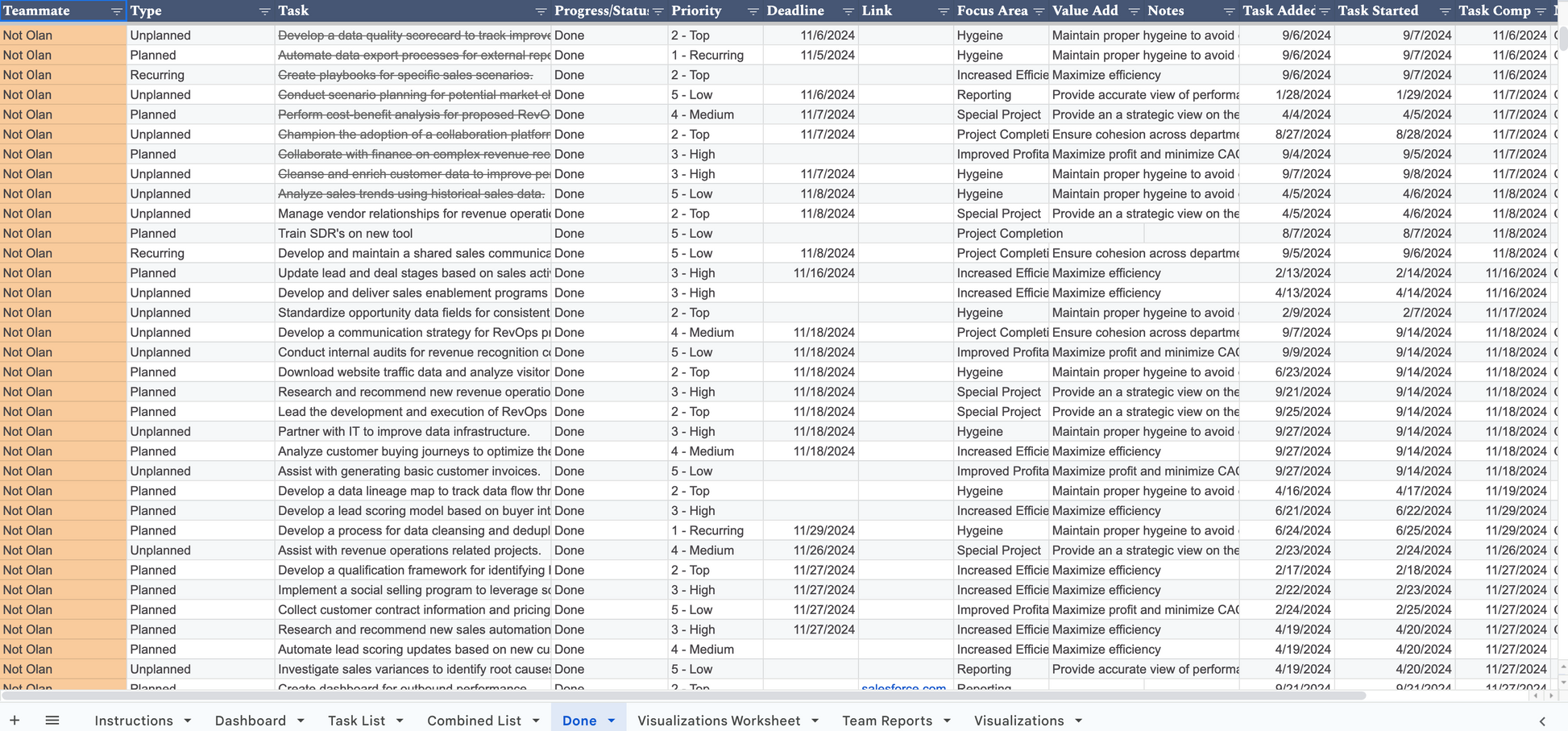 This Automated Team Tracker gives you a birds eye view of your entire teams workload. Each of your teammates have an individual automated task tracker that they use on a daily basis to organize their workload. The team task tracker automatically syncs each of the individual task trackers into one spreadsheet. This allows managers to easily monitor how each person is performing to offer support as needed.